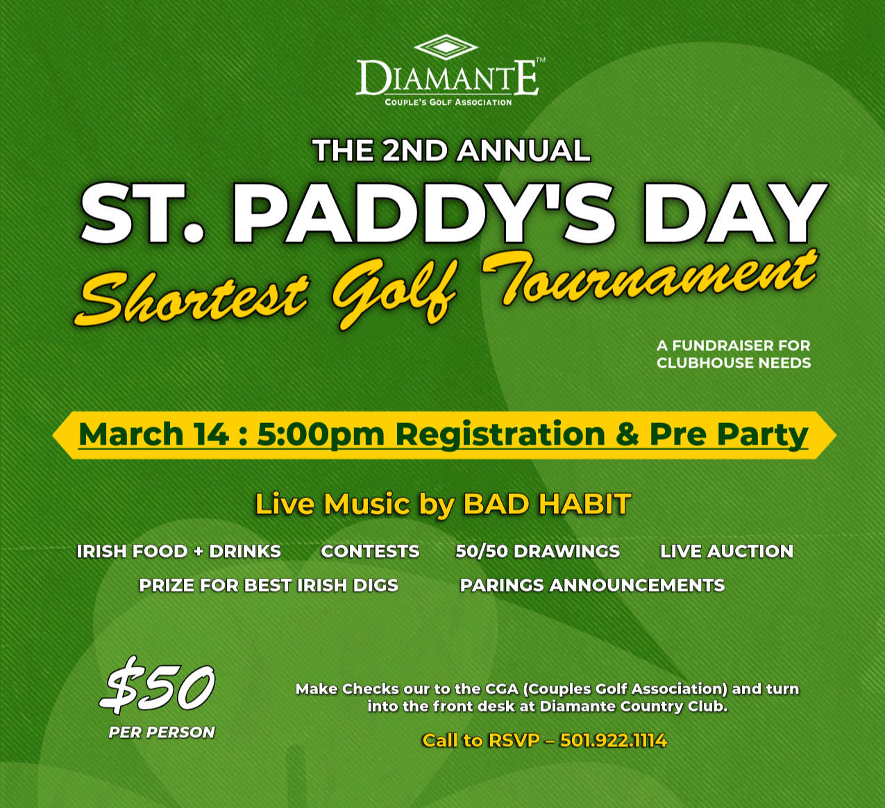 For Members not participating in the 2nd Annual St. Paddy’s Day Shortest Golf Tournament, we invite you to join us for a festive and fun-filled evening at our St. Paddy’s Pre-Party on March 14th at 5:00 PM.