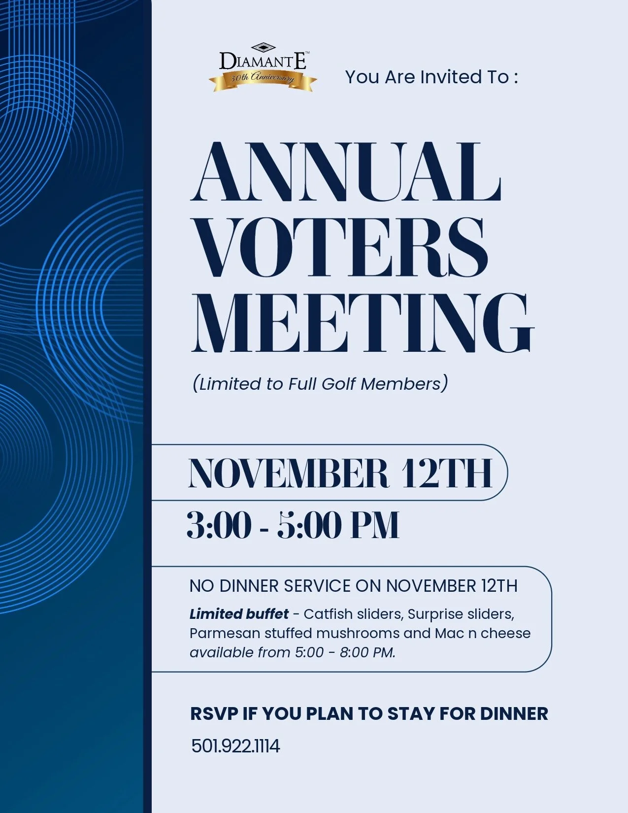 Please join us at the Annual Voters Meeting to learn and discus important subjects about Diamante Country Club.