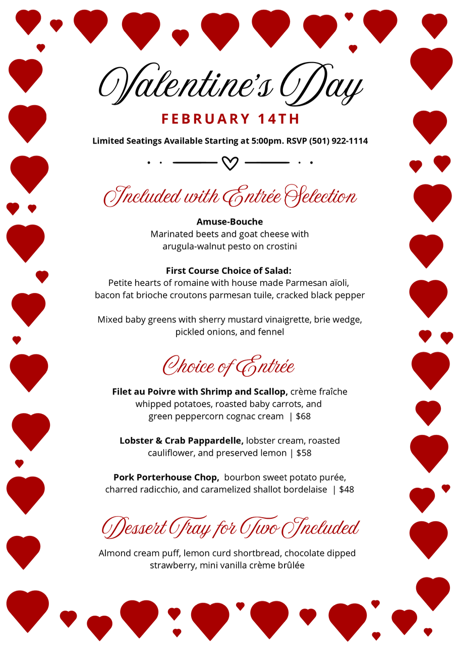 Back to All Events Valentines Day Dinner Saturday, February 14, 2026 4:30 PM 8:00 PM Diamante Country Club 2000 Country Club Drive Hot Springs Village, AR 71909 (map) Google Calendar ICS